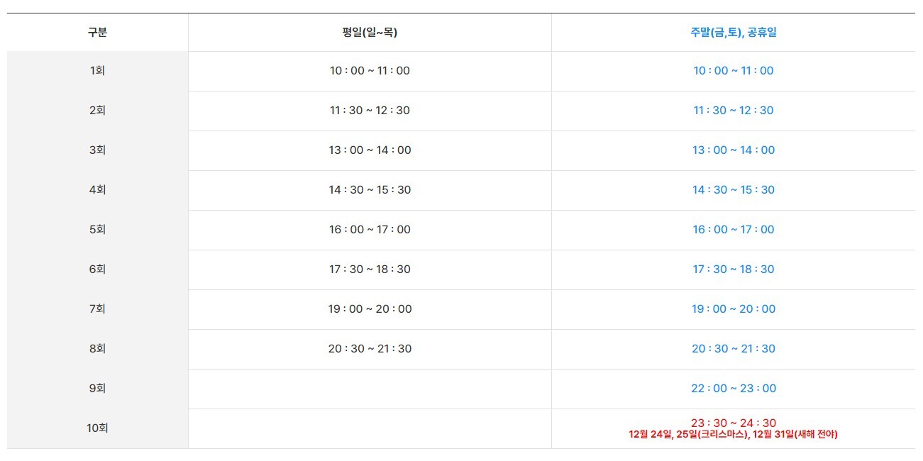 | 요일 | 매주 화, 수 ,목 | 매주 토~일요일 |