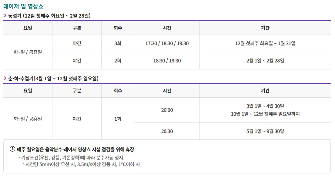 | 화~금 | 주간 | 2회 | 14:00 / 17:00 | 3월1일~4월30일 10월~12월 첫쨰주 일요일까지 |