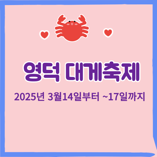 대한민국을 대표하는 대게 축제 "2025 영덕대게축가가 열립니다. 대게의 본고장에서 직접 맛보고 다양한 체험을 줄길 수 있는 평소 비싸서 못 먹던 대게를 이번축제에 방문하셔서 신선하고 맛난 대게를 만나보시기 바랍니다. "2025 영덕대게 축제의 정보와 가는 길, 대게시세등을 정리하여 드립니다.